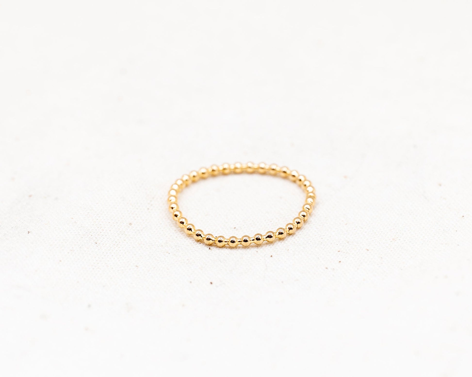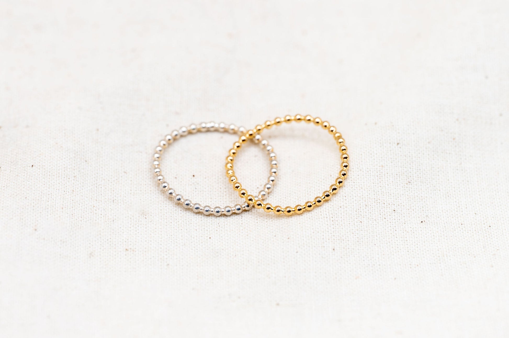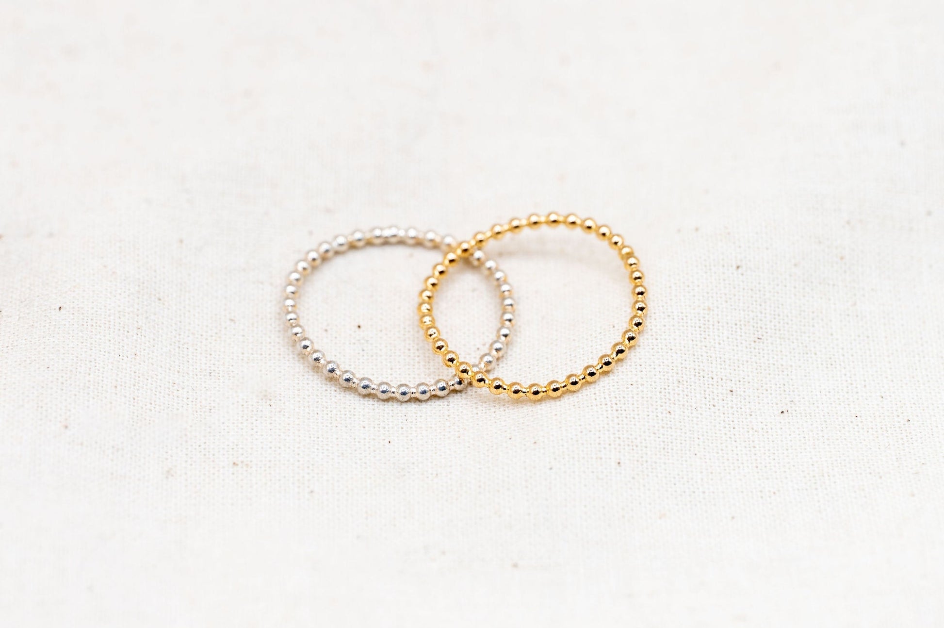 This ring has a beaded wire pattern that gives it a simple and dainty look, the ideal design for stacked ring arrangements. It looks great alone or paired with our other rings for a more unique look.