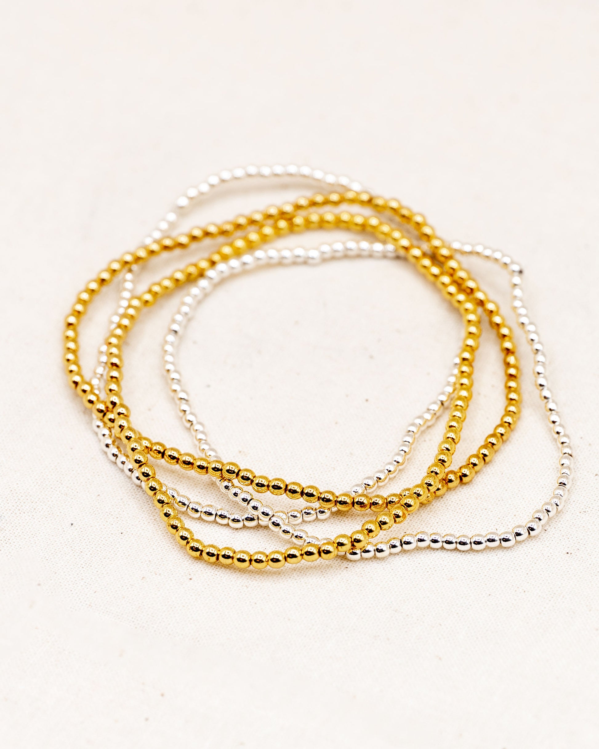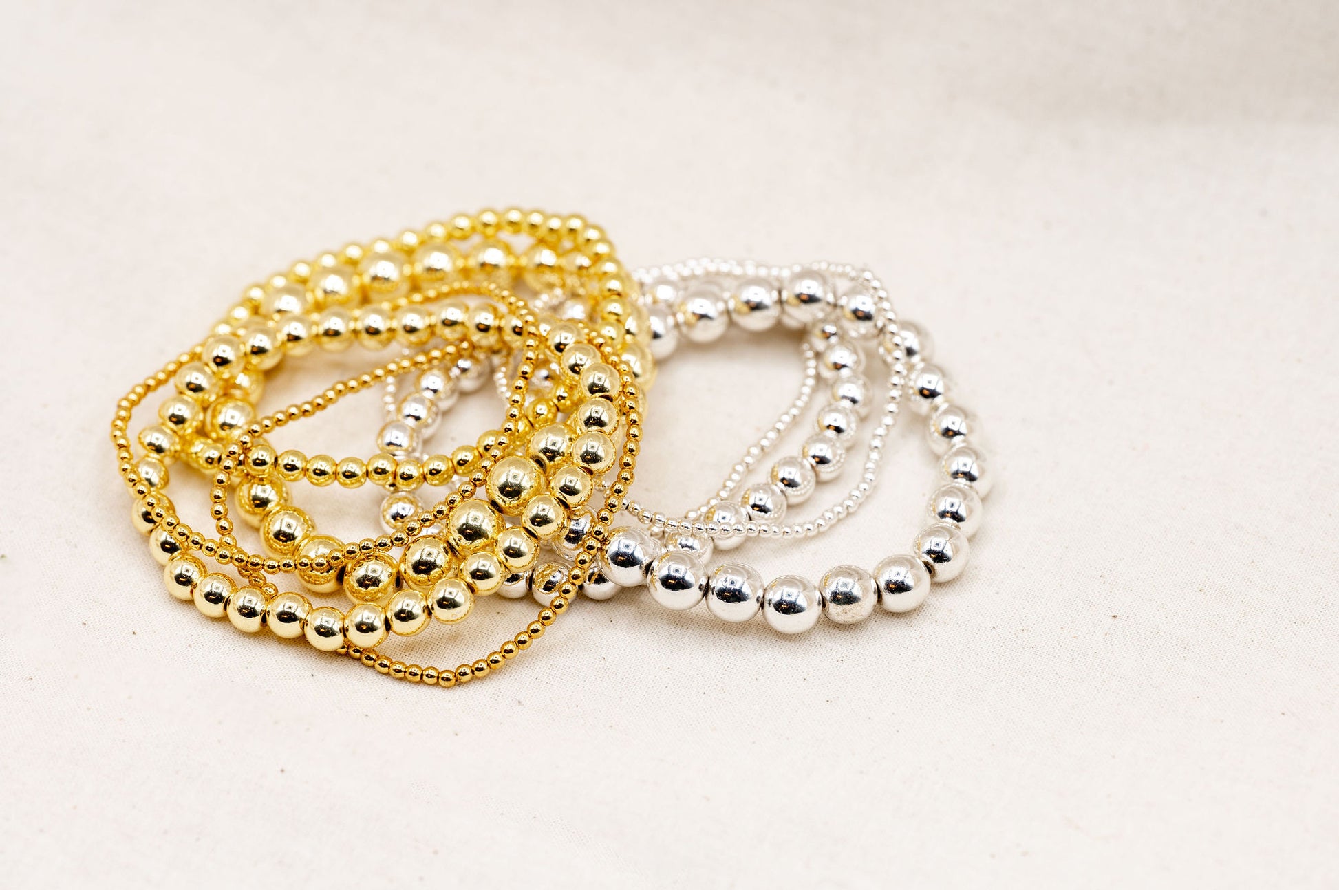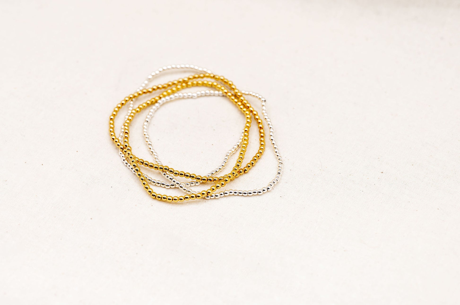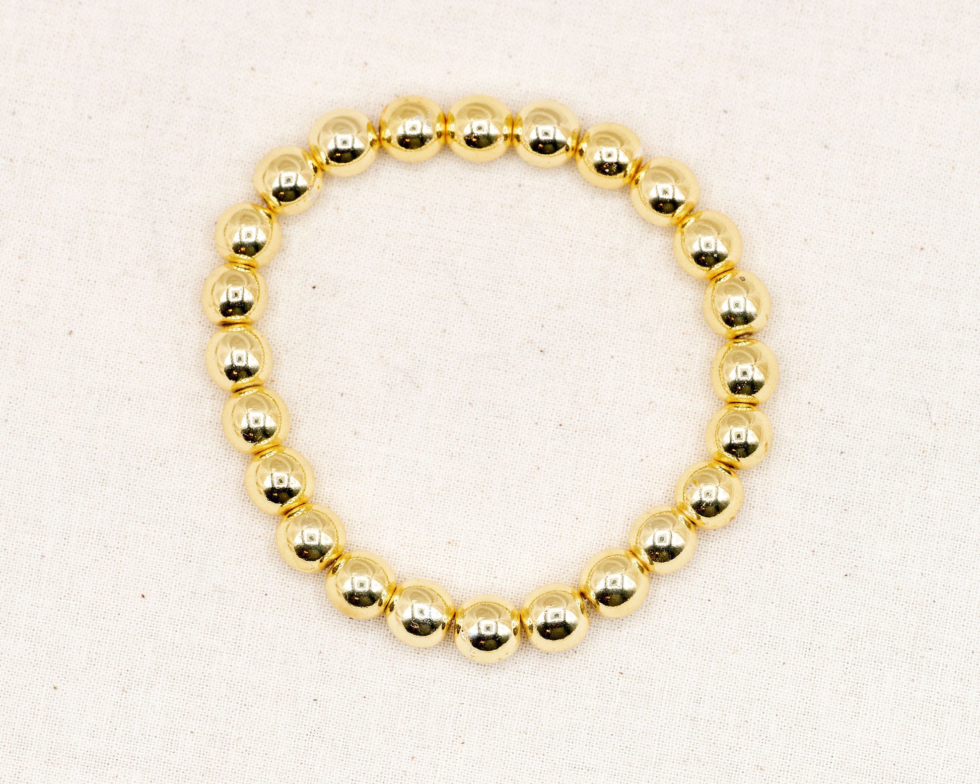 These stretch bracelets are made with silver or gold plated hematite beads. Hematite beads are a natural stone that can help with grounding, removing negative energy, increasing confidence, and decreasing stress.