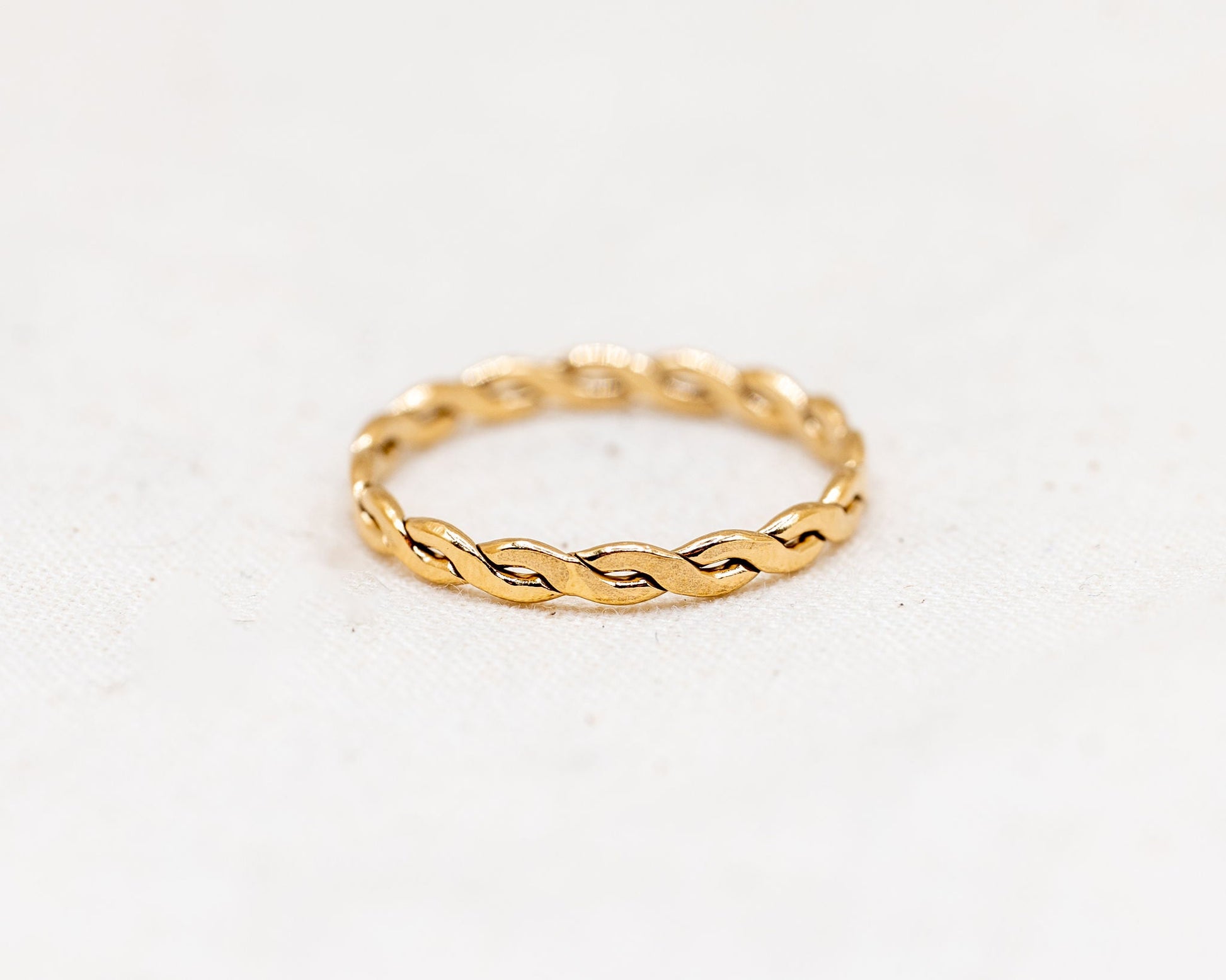 This ring has a woven pattern that gives it a simple and dainty look, the ideal design for stacked ring arrangements. It looks great alone or stacked with our other rings for a more dramatic look.